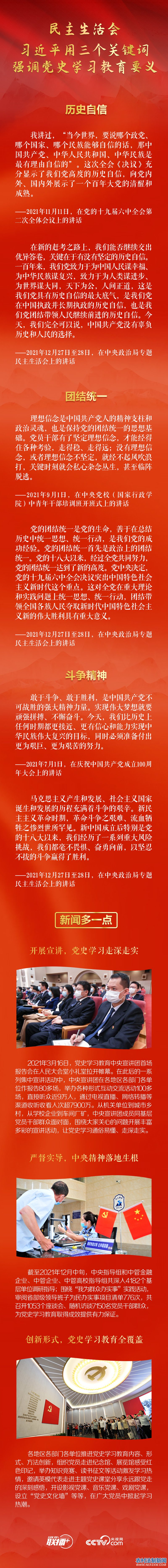 2021年底,中央政治局召开党史学习教育专题民主生活会,总书记用历史自信、团结统一、斗争精神三个关键词强调党史学习教育要义:全党要学史明理、学史增信、学史崇德、学史力行,就是为了增加历史自信、增进团结统一、增强斗争精神。