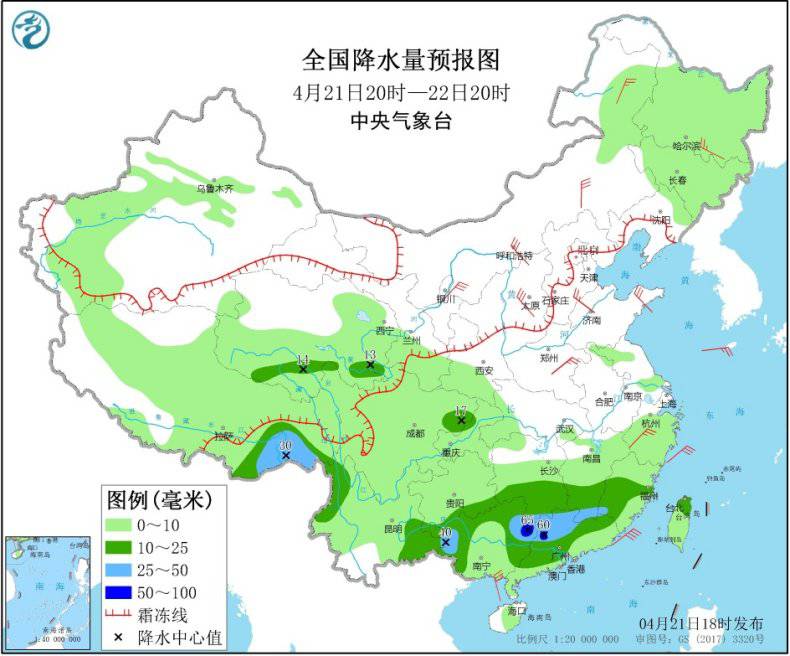 图1 全国降水量预报图(4月21日20时-22日20时)