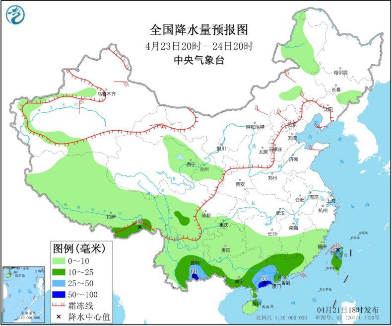 4月23日20时至24日20时,西藏东南部、西南地区南部、广西南部和东部、广东大部等地的部分地区有中到大雨,其中,云南南部、广东西南沿海局地有暴雨(50~60毫米)。新疆沿天山地区及南疆盆地、内蒙古中东部、辽东半岛、华北北部、山东半岛等地的部分地区有4~6级风(见图3)。
