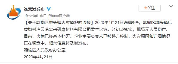 人民网北京4月21日电 21日晚,江苏省连云港市赣榆区人民政府办公室发布通报称,4月21日晚9时许,赣榆区城头镇后黄墩村连云港宏兴研磨材料有限公司发生火灾。经初步核实,现场无人员伤亡。