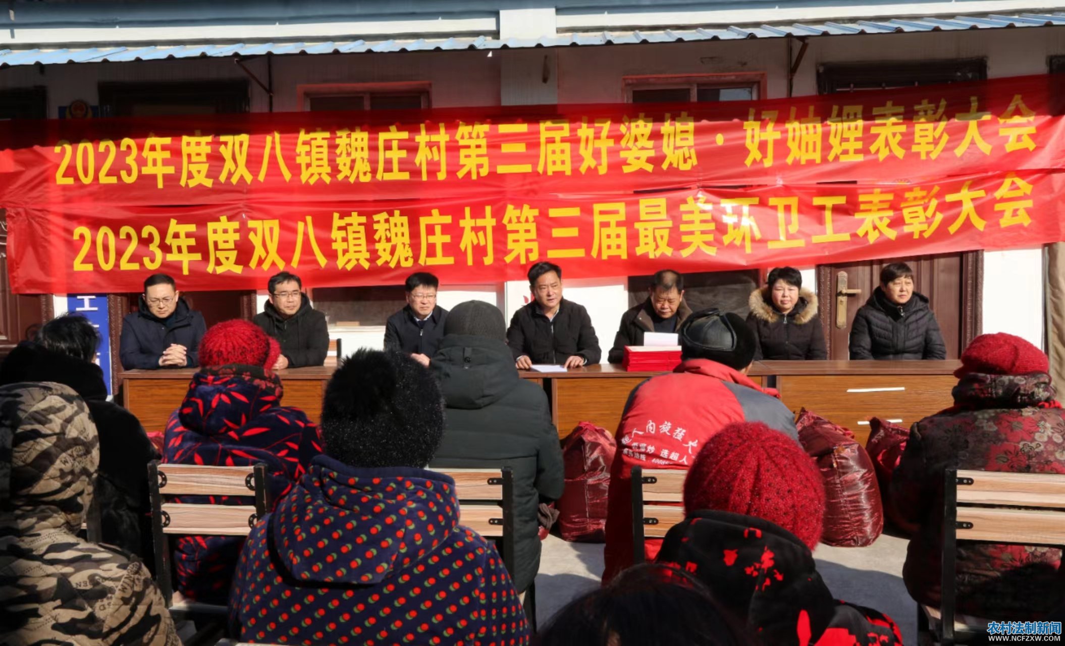 2024年1月24日,商丘市梁园区双八镇魏庄村村室院内人头攒动,彩旗飘扬,简易组建的舞台前摆满了奖品和荣誉证书,醒目的会议标语让村民们交头接耳在七嘴八舌的议论着。只见会标上写着:2023年度双八镇魏庄村第三届“好婆媳、好妯娌”表彰大会;2023年度双八镇魏庄村第三届最美环卫工表彰大会。原来是村里在表彰先进,群众们在望眼欲穿的等待着被评为先进的村民代表出场呢!