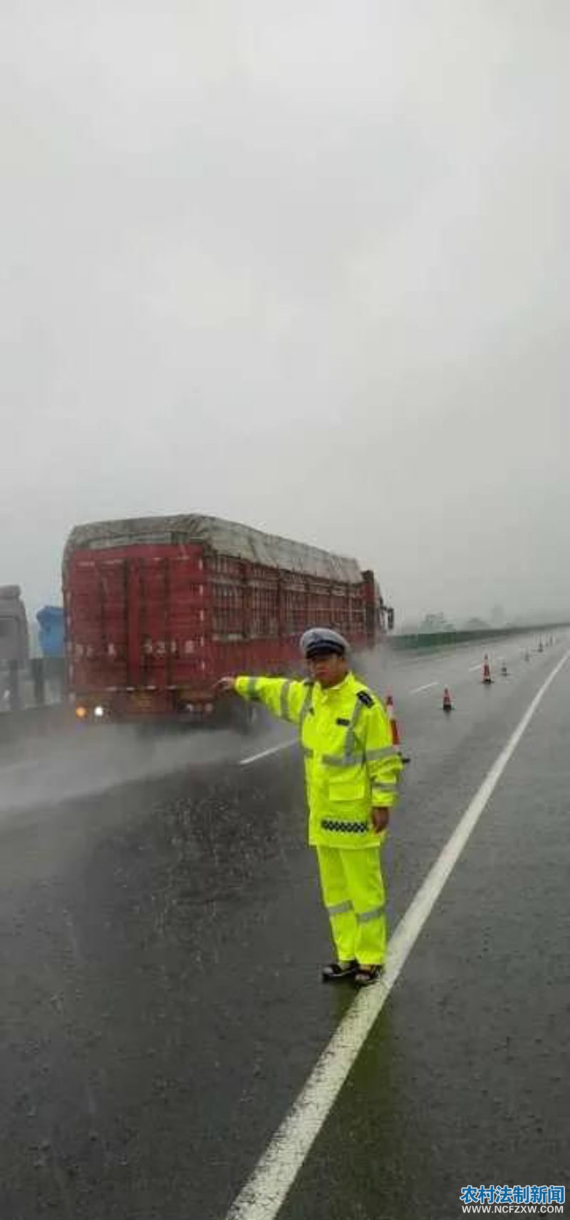 据商丘市公安局交警支队高速大队五中队中队长刘再臣介绍,当日上午11时40分许,他和中队人员焦阳、丁印阳等接到大队指挥中心指令,称商南高速公路93公里东半幅有辆大货车撞到了护栏,无法移动。刘再臣迅速赶到事故现场,民警发现几节护栏被撞得弯弯曲曲变了形,货车车头右侧也是面目全非,车辆卡在护栏上,无法移动。“如果不快速处置,湿滑的道路随时会引发二次交通事故”,民警第一时间在事故现场后方摆放安全锥桶设置警戒,在后方警戒拉响警报,提醒过路司机注意安全。同时联系施救人员,找来吊车在雨中快速施救。此时,大雨滂沱,风雨交加。民警及施救人员被淋得全身湿透。经过众人20多分钟的紧急施救,终于将半挂货车成功从中央隔离带内拖出带离高速公路,化解了这次雨中事故。司机高速民警,他姓方,山东菏泽人。驾驶鲁GW5***半挂大货车,行驶途中突遭暴雨,因视线不清采取急刹车,造成车辆失控,撞上了右侧护栏。幸亏他紧握方向盘,擦着护栏前行了20多米,才没有造成车辆侧翻或冲进高速边沟内。幸好,他受到了一番惊吓,但没有受伤。