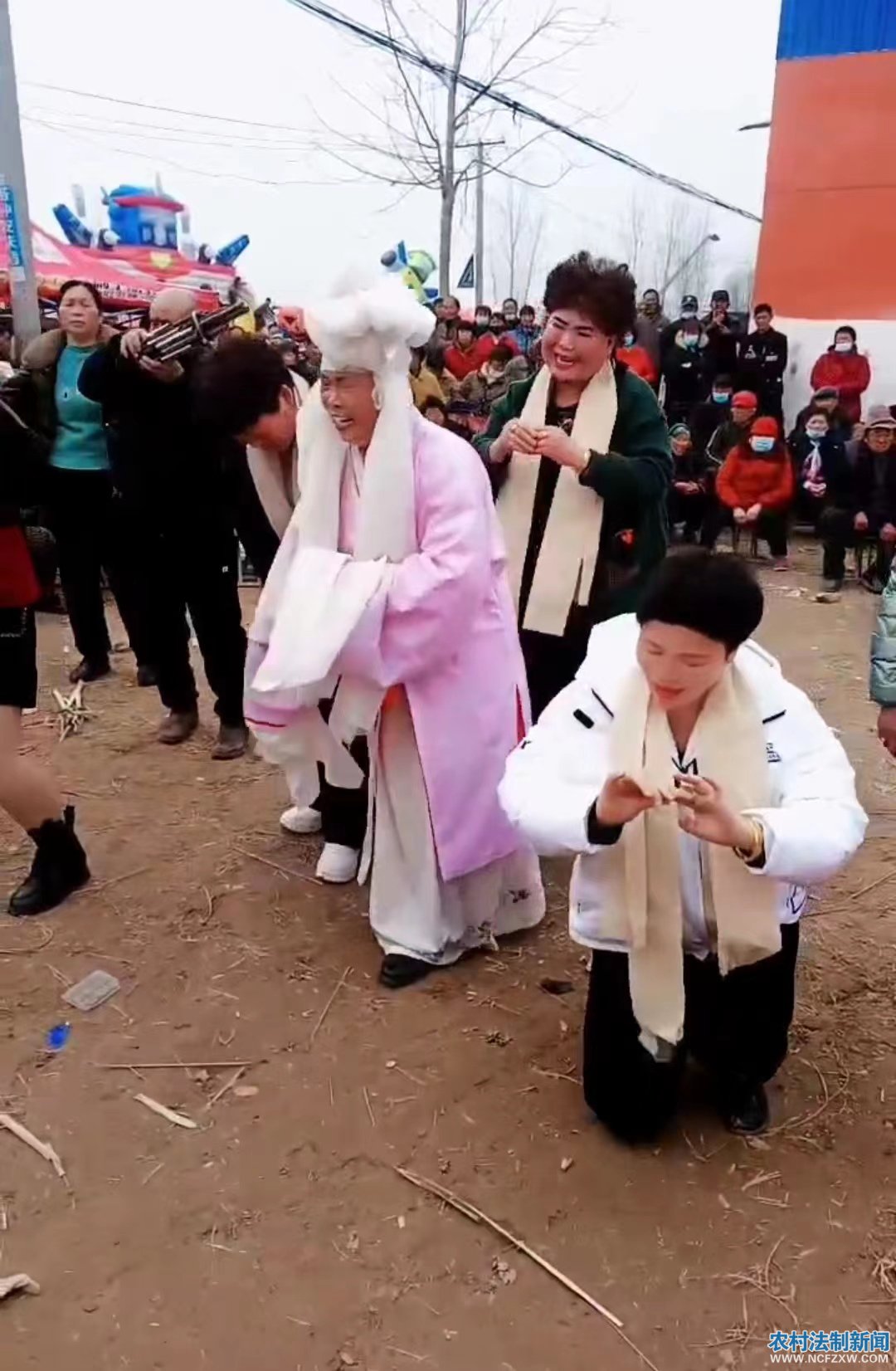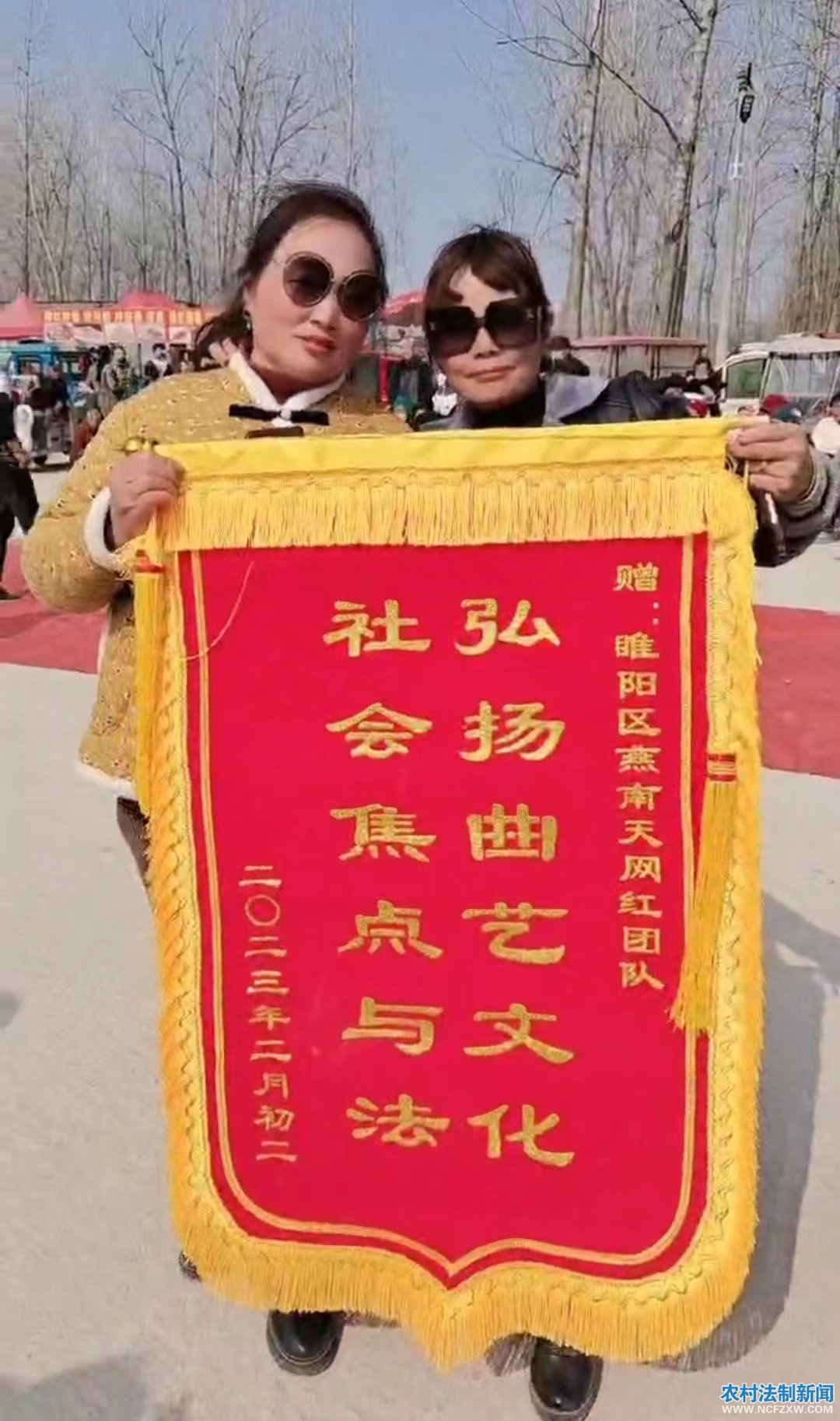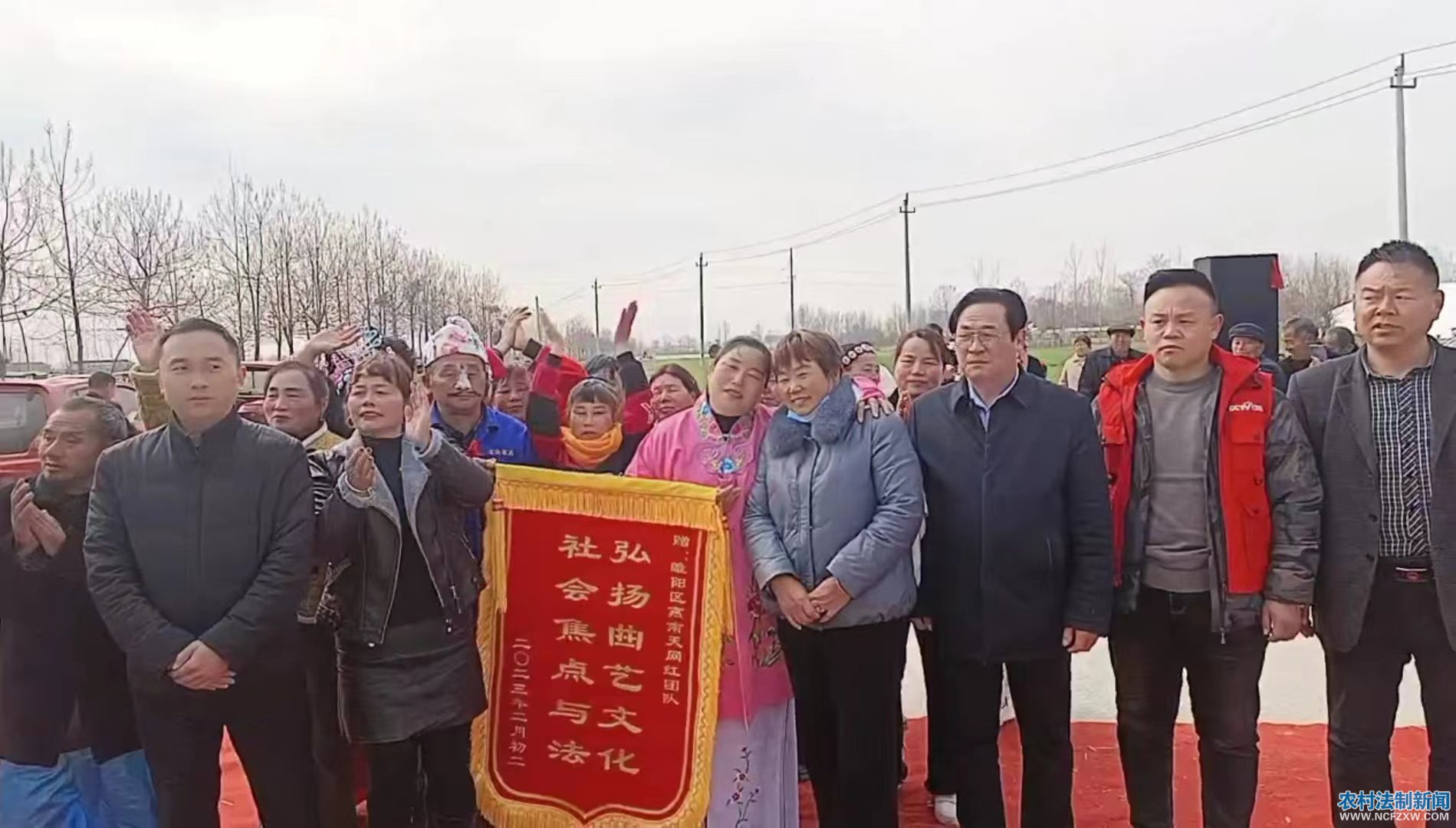 农村法制新闻网.讯 记者:燕啟超 通讯员: 刘成宏 陈大伟 高岩岩 张新民 李其光 柳泛鹅黄,春意盎然。2月25日上午,闻听农民自发组织“燕南天网红团队”为晋庄村庙会送去了精彩的文化大餐,中原高科技农副产品博览会筹委会、社会焦点与法栏目负责人和央视领导一行四人赠前往河南省商丘市睢阳区坞墙填晋庄村庙会现场进行采访并给“燕南天网红团队"送去了锦旗,以鼓励他们为文化自信和弘扬中华传统文化所做出的贡献。