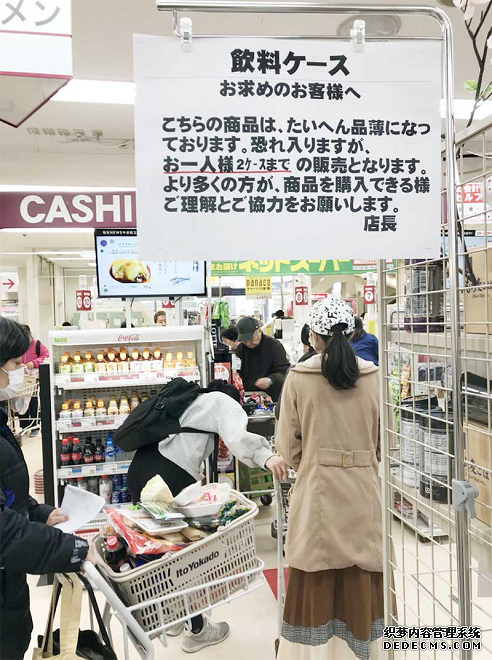 东京都知事呼吁当地民众不要外出后,民众开始囤积物资,超市限购买。(李沐航 摄)