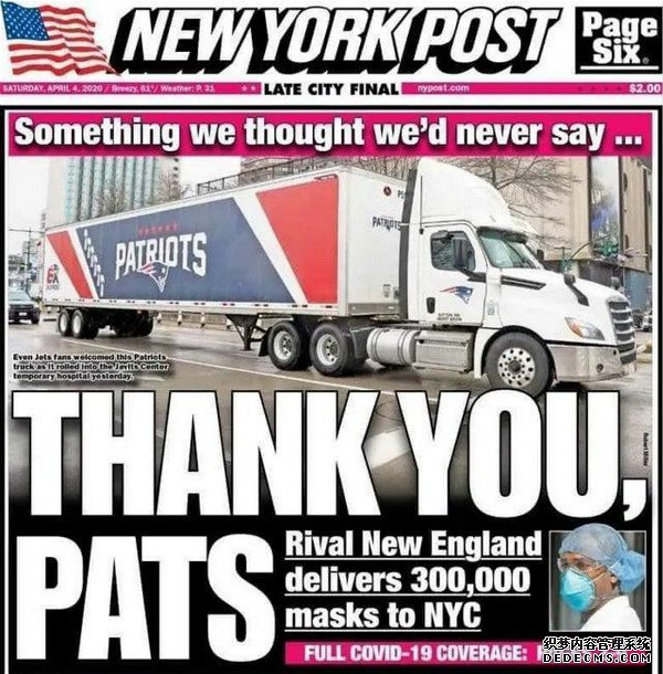 新华社北京4月8日电 当喷涂有新英格兰爱国者队队徽的集装箱卡车开进纽约,《纽约邮报》不吝贡献出头版:“有些话我们以为永远不会说——谢谢你,爱国者队。”