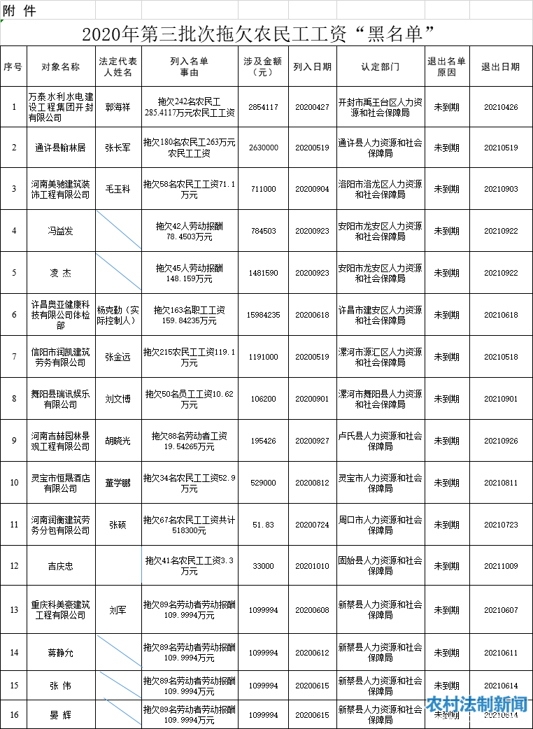 12月22日,河南省人力资源和社会保障厅公布一批拖欠农民工工资黑名单。
