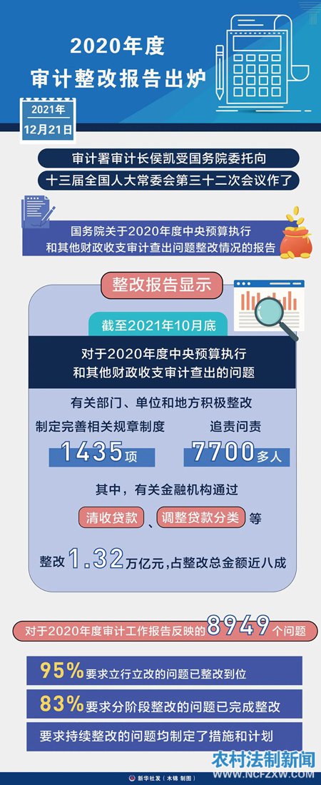 “党中央、国务院高度重视审计整改工作。习近平总书记多次作出重要指示批示,要求被审计单位承担起审计整改的主体责任,主要负责人要尽好责抓到位,严格落实审计整改要求。”2021年12月21日,在十三届全国人大常委会第三十二次会议上,受国务院委托,审计署审计长侯凯作国务院关于2020年度中央预算执行和其他财政收支审计查出问题整改情况的报告时如是说。