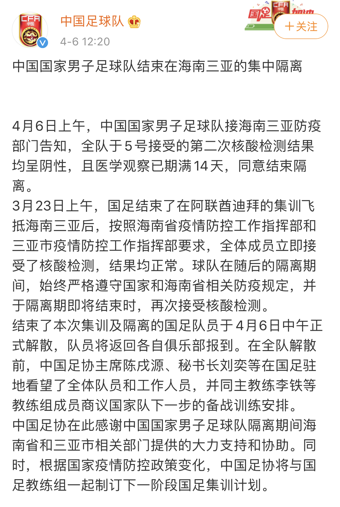 4月6日上午,中国国家男子足球队接海南三亚防疫部门告知,全队于5号接受的第二次核酸检测结果均呈阴性,且医学观察已期满14天,同意结束隔离。