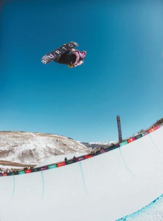 当地时间2月29日,蔡雪桐在比赛中。当日,在美国科罗拉多州韦尔滑雪场进行的美国公开赛单板滑雪U型场地比赛中,蔡雪桐获得女子组冠军。