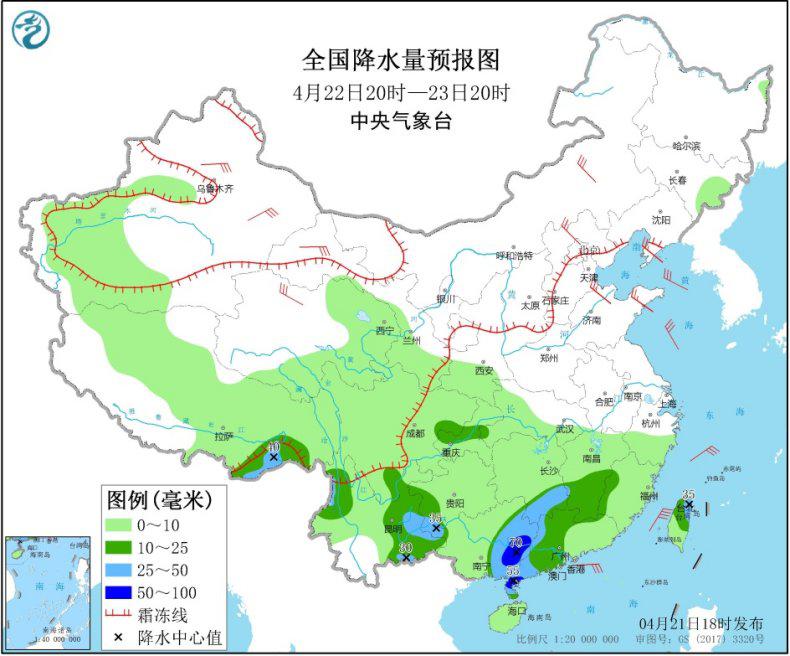 图1 全国降水量预报图(4月21日20时-22日20时)
