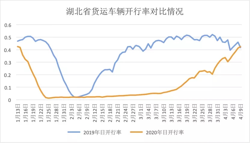 随着战疫取得重要胜利和复工复产进程不断推进,湖北地区的对外交通现全面恢复。货运平台数据显示,4月10日,湖北省重载货车日达产率为去年同期的108.5%;其中武汉市日达产率为去年同期的88%。总体来看,湖北省重载货车日达产率已接近去年同期水平。值得关注的是,4月10日,武汉周边城市的重载货车日达产率均已接近去年同期水平,其中孝感为94%,黄冈为85.8%,鄂州为85.2%,荆州为93.2%。