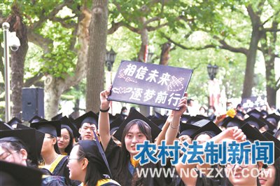 6月8日,上海师范大学的毕业典礼上,毕业生手举写有“相信未来 逐梦前行”字样的牌子。资料图片