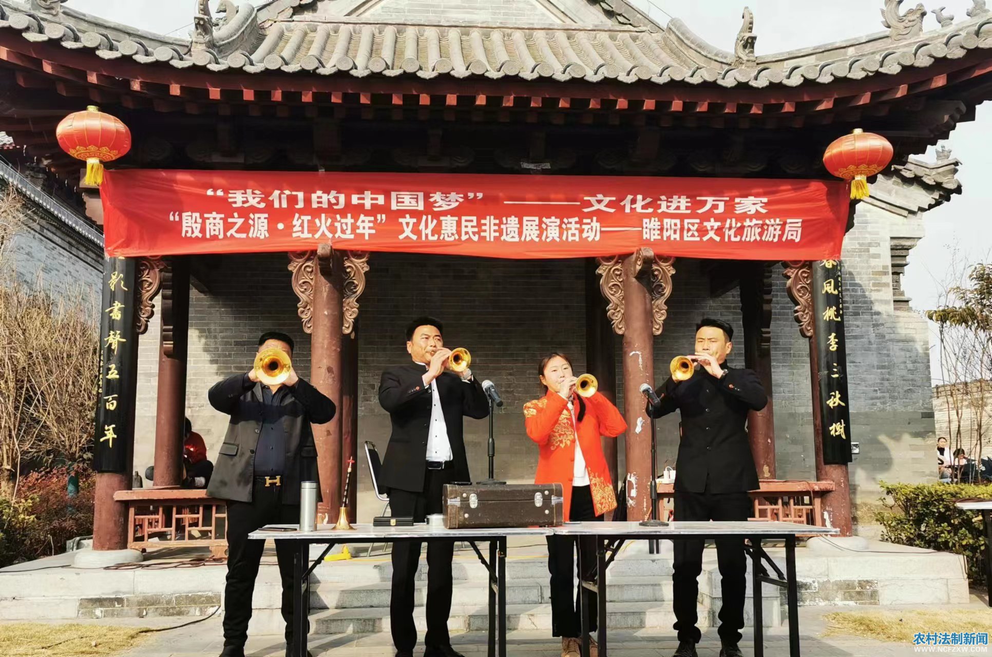 在当天的活动中,睢阳区文化旅游局还精心准备了唢呐演奏和舞狮、盘鼓等展演,喧天的锣鼓、威武的舞狮、飞舞的彩绸……将即将到来的元宵佳节的气氛烘托得格外浓烈,让现场观众大饱眼福。