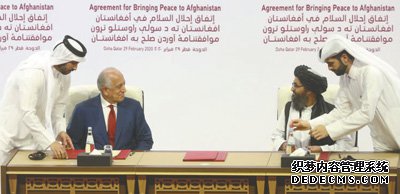2020年2月29日,在卡塔尔首都多哈,美国阿富汗事务特使扎尔梅·哈利勒扎德(左二)和阿富汗塔利班创始人之一毛拉阿卜杜勒·加尼·巴拉达尔(右二)参加和平协议签署仪式。 |