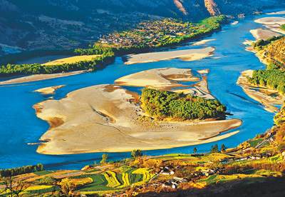 云南省丽江市玉龙纳西族自治县石鼓镇,便坐落在这个“V”字的底部。因为这个景观,当地诗人曾写道:“山连云岭几千叠,家在长江第一湾。”