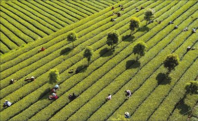 图为日前,湖北省襄阳市南漳县肖堰镇万亩茶园内,农民正在采摘春茶。当地大力发展茶旅融合,目前全镇有机茶园总面积2万多亩,高效茶园面积2000亩。