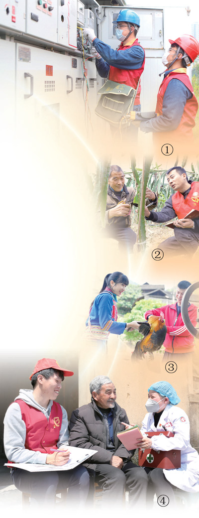图①:安徽滁州供电公司“红马甲”党员服务队年轻党员对电力设备进行检查,保障复工用电。