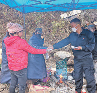 姚聪学(右)在给贫困户发口罩,并回访危改后的住房情况。 |