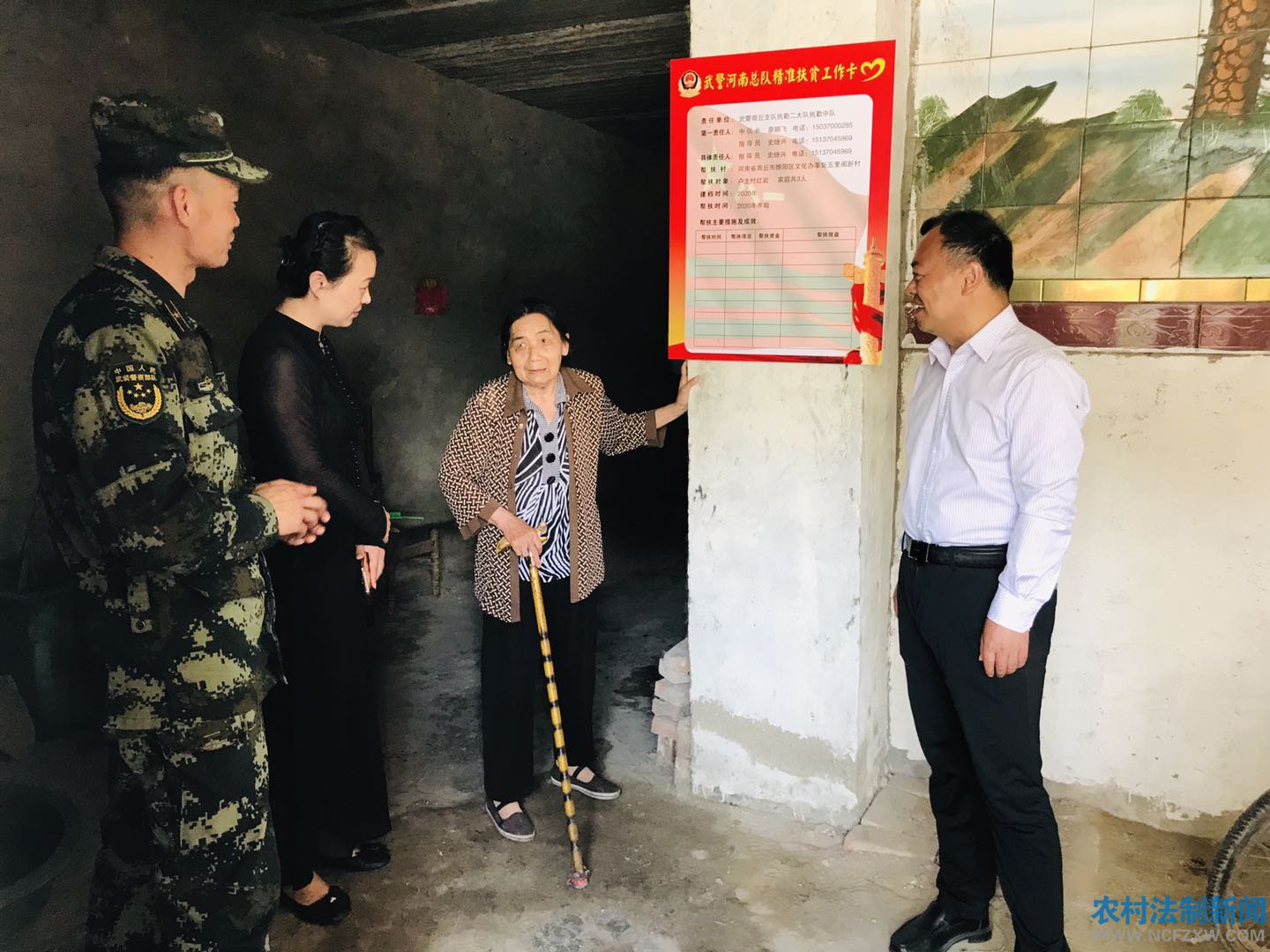上午十时,文化街道办事处党工委书记孙海涛、宣传委员杨雯带领办事处工作人员,和武警商丘支队执勤二大队执勤中队指导员史继兴带领的武警官兵汇合一处,来到帮扶对象商桐社区五里阁居民付红岩家中,进行重点帮扶活动。