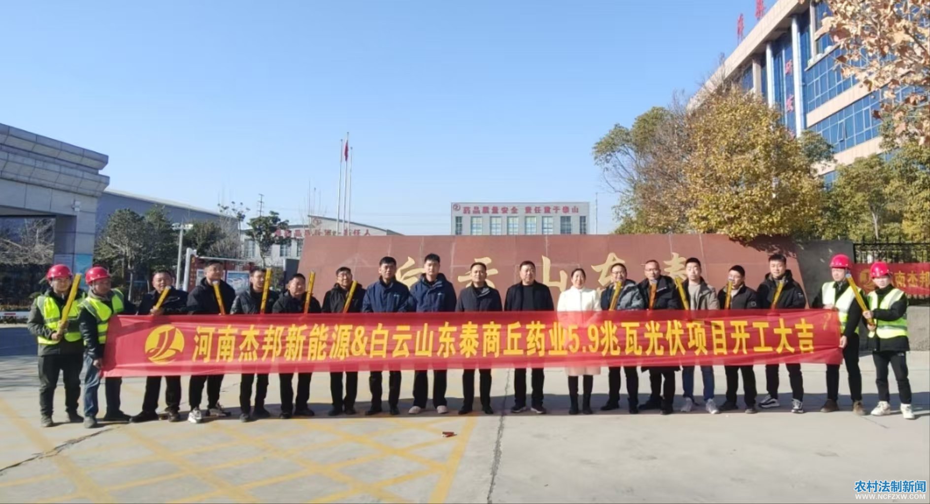 农村法制新闻网.讯 记者:燕啟超 通讯员: 陈大伟 高岩岩 梁忠强 1月17日,河南杰邦新能源科技有限公司与白云山东泰商丘药业第一期4.73 兆瓦屋顶分布式光伏发电项目,在商丘市梁园区白云山东泰商丘药业有限公司举行开工仪式。