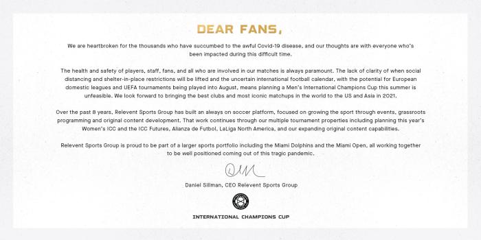 客户端4月11日电 (王思硕)受疫情及潜在赛程变更影响,2020年国际冠军杯取消。赛事方在声明中表示:“球员、员工和工作人员健康要放在第一位,目前何时结束居家隔离还是问号,赛程如何安排也是未知数。另外欧洲联赛和欧冠可能会在八月进行,这意味着今夏不具备举行国际冠军杯赛的可操作性。我们期望在2021年,继续为大家在美洲和亚洲带来最佳俱乐部之间的对决。”