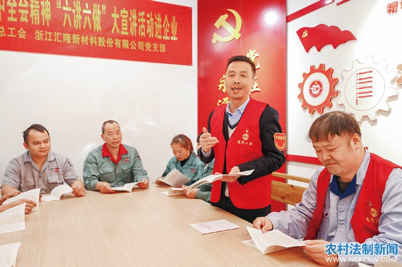 浙江省湖州市德清县总工会组织由车间政委、劳动模范、浙江工匠等组成的“典型模范宣讲团”走进企业宣讲党的十九届六中全会精神。图为2021年11月30日,宣讲团成员在浙江汇隆新材料股份有限公司的红色车间为职工宣讲全会精神。 人民图片 姚海翔/摄