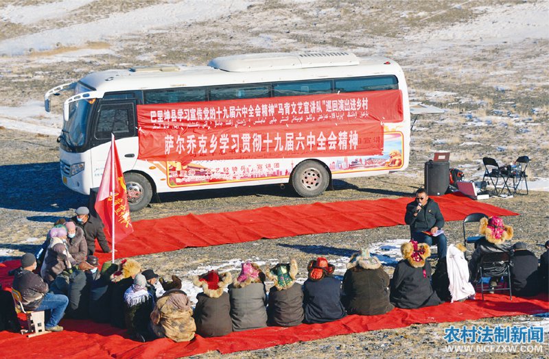 新疆巴里坤哈萨克自治县组建“马背文艺宣讲队”,深入边远农牧区乡村开展党的十九届六中全会精神巡回宣讲。图为2021年12月1日,宣讲队给冬牧场的哈萨克族牧民宣讲全会精神。 人民图片